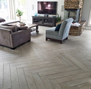 Who is loving this herringbone pattern install we did? We are! Julian Tile - Stone Fusion: 6x36 (Colour: Milk)